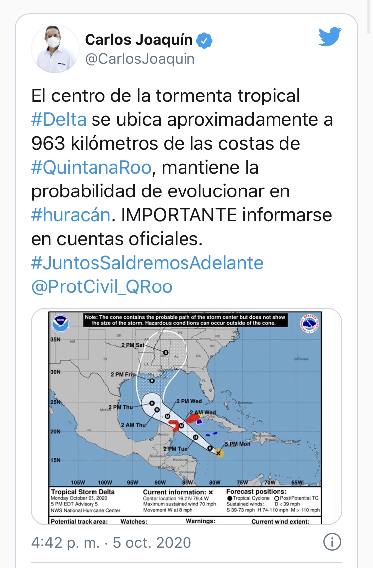QUINTANA ROO, 5 de octubre.- La tormenta tropical Delta continúa fortaleciéndose en el Mar Caribey de acuerdo a la última actualización del Centro Nacional de Huracanes (NHC) de Estados Unidos, podría alcanzar a ser un huracán de categoría 3 o 4.