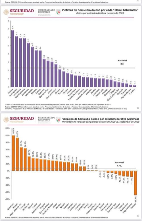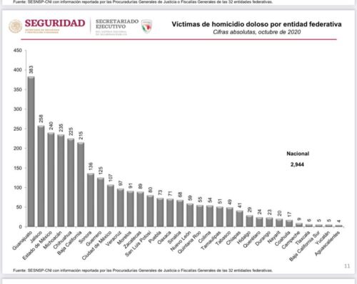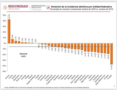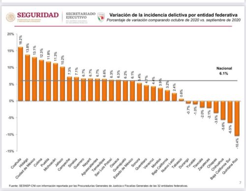 De acuerdo con estos datos, la entidad registró una variación a la baja, con -20.3%, de homicidio doloso por entidad federativa, comparando octubre de 2020 contra el mismo mes del año pasado.