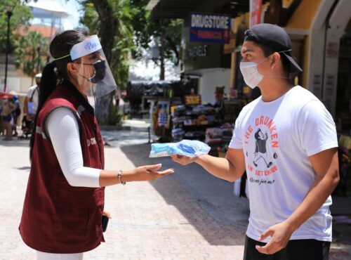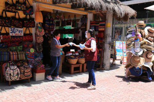 PLAYA DEL CARMEN, Quintana Roo, 24 de julio .-Continúa la entrega de kits sanitizantes a la población por parte del Ayuntamiento de Solidaridad en el marco de la campaña preventiva “Libre de Brotes”. En esta ocasión, se distribuyeron entre comerciantes y locatarios de la Quinta Avenida, para seguir incentivando la reactivación económica del municipio que actualmente cuenta con el 40% de las empresas reabiertas y una ocupación hotelera del 21.7% en la Riviera Maya, de acuerdo a la Secretaría de Turismo del estado.
