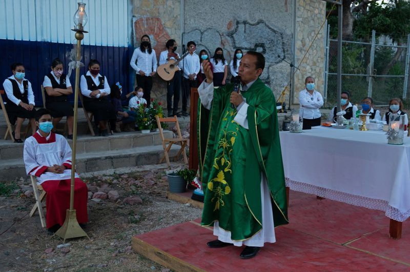El párroco de la iglesia de la Señora del Refugio, Jorge Luis Sánchez, ofició la misa ante más de un centenar personas que se congregaron en un espacio al aire libre junto a la carretera.
