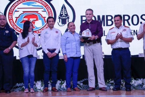 Cabe destacar que el Cuerpo de Bomberos de Tijuana, a través del instructor Pedro Perfecto Lugo, entregó el casco conmemorativo a la XV edición de la Academia de Bomberos de Playa del Carmen a la Presidenta Municipal.