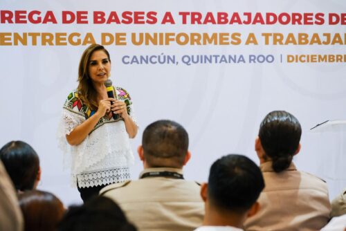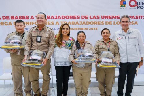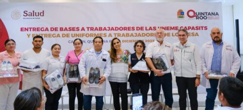 Cancún. 20 de diciembre de 2025- Al entregar 17 bases laborales al personal de las Unidades de Especialidades Médicas y Centros Ambulatorios para la Prevención y Atención del VIH/SIDA e Infecciones de Transmisión Sexual (UNEME CAPASITS), de Cancún y Chetumal, así como uniformes para 6 mil 400 trabajadoras y trabajadores de los Servicios Estatales de Salud (SESA), la gobernadora Mara Lezama Espinosa expresó su satisfacción porque para este gobierno humanista con corazón feminista cada uno de ellas y ellos son el engranaje perfecto para el cuidado de la salud de las y los quintanarroenses.