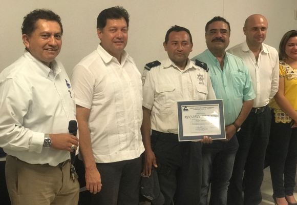 PLAYA DEL CARMEN, Quintana Roo, 8 de septiembre.- La Cámara Nacional de Comercio, Servicios y Turismo de Playa del Carmen entregó un reconocimiento al Policía Tercero, Julio César González Mendoza, elemento de la Policía Turística de Solidaridad por su ejemplar cumplimiento del deber, al rescatar a un ciudadano de dos delincuentes quienes golpeaban para asaltarlo y gracias a la intervención de policía, quien sometió y arresto a los agresores, estos fueron arrestados y puestos a disposición de la Fiscalía General del Estado.