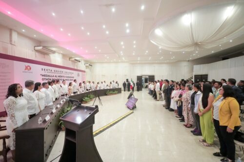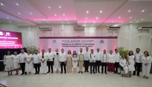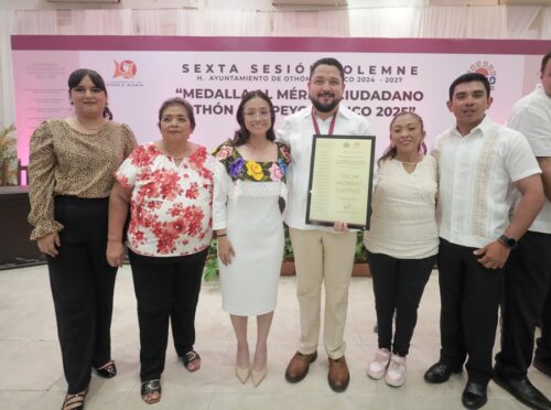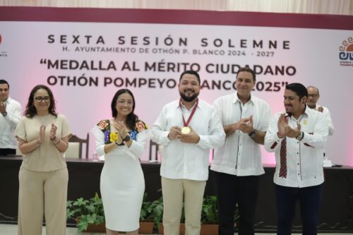 CHETUMAL, 26 de junio. La presidenta municipal de Othón P. Blanco, Yensunni Martínez Hernández, entregó a Óscar Moreno Castillo la Medalla al Mérito Ciudadano “Othón Pompeyo Blanco” 2025, chetumaleño de gran corazón y un firme compromiso con la Transformación del municipio.