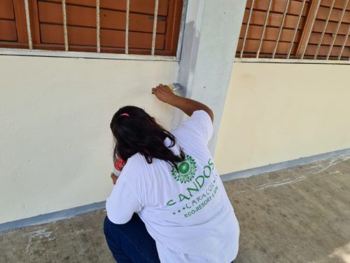 PLAYA DEL CARMEN, Quintana Roo, 02 de octubre. – Integrantes de la brigada del programa social Acuerdo Nacional Contra el Cambio Climático, con apoyo de trabajadores de las áreas de mantenimiento de diversos hoteles de la Riviera Maya, iniciaron con los trabajos de pintura en la secundaria técnica, número 23, Juan Rulfo.