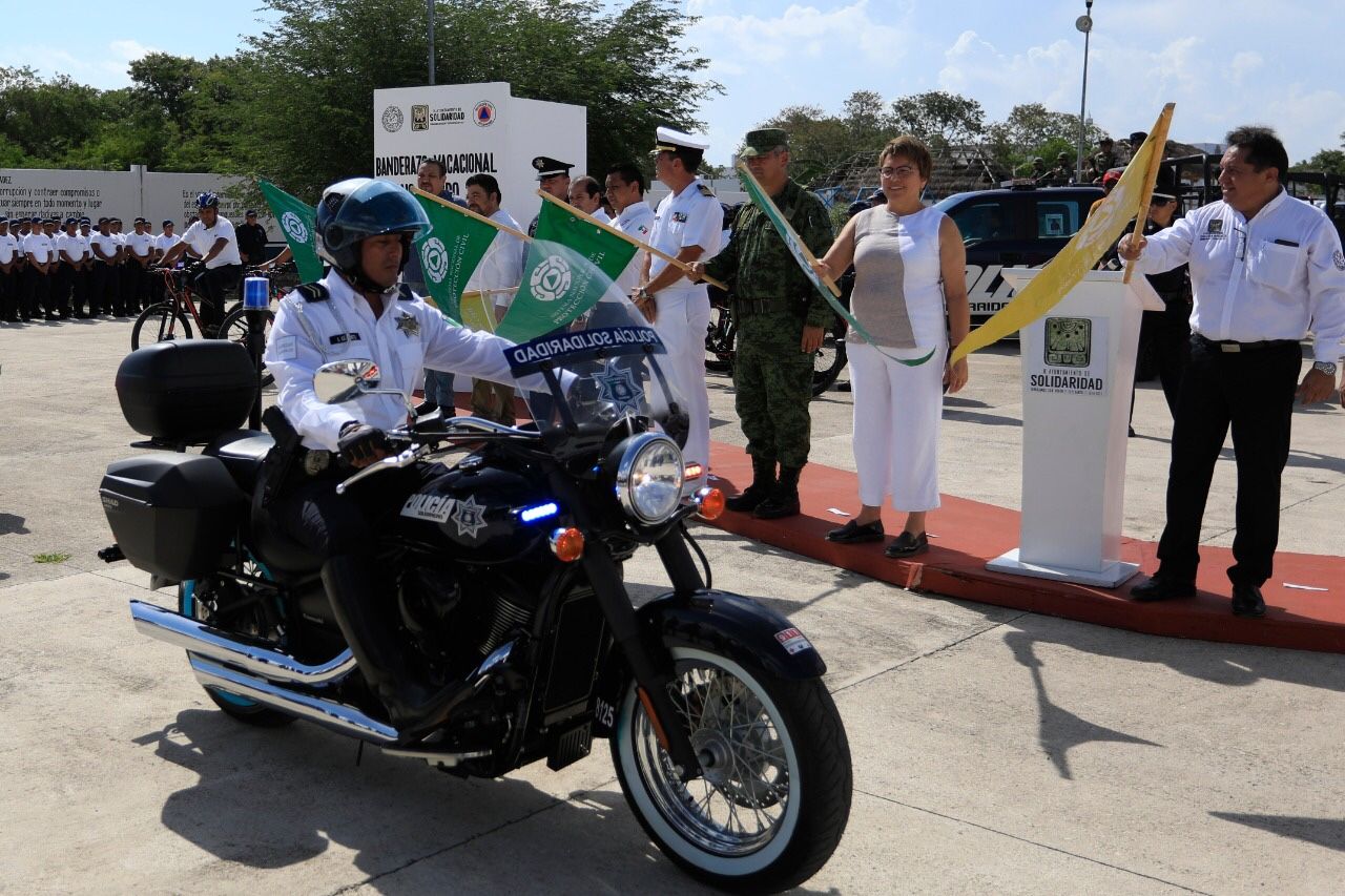 PLAYA DEL CARMEN, Quintana Roo, 8 de julio .-Con el objetivo de garantizar la seguridad de los turistas que nos visitan en la presente temporada vacacional, la presidenta municipal de Solidaridad, Laura Beristain Navarrete, encabezó el banderazo del inicio del operativo “Verano Seguro 2019” (del 8 de julio al 25 de agosto), al tiempo que entregó 10 motocicletas e igual número de bicicletas a la Dirección General de Seguridad Pública y Tránsito Municipal.