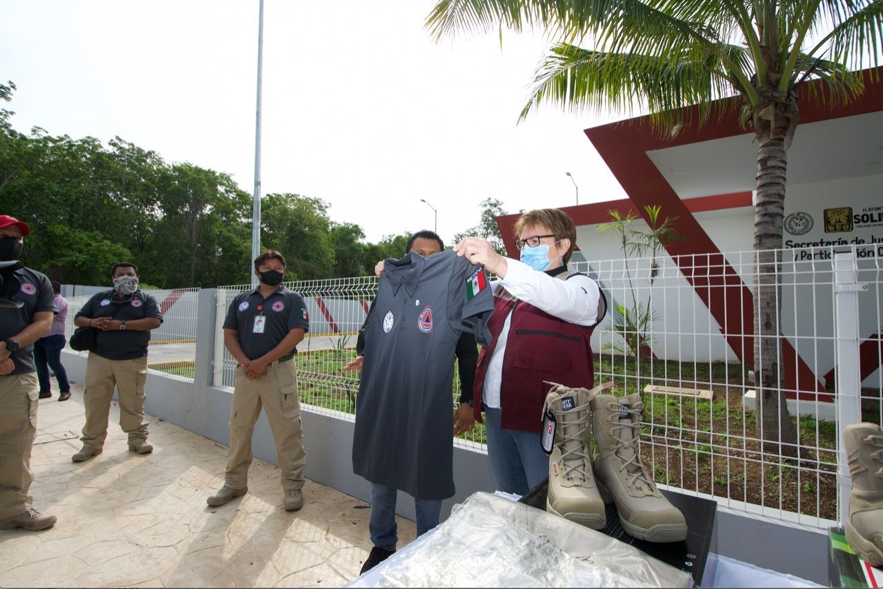 PLAYA DEL CARMEN, Quintana Roo, 29 de mayo.- El gobierno de Solidaridad que encabeza Laura Beristain Navarrete, entregó 50 uniformes, compuestos por 200 playeras, así como 100 pantalones tácticos y 50 botas tácticas, para fortalecer la labor del personal operativo de la Secretaría de Protección Civil, Prevención de Riesgos y Bomberos