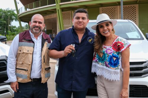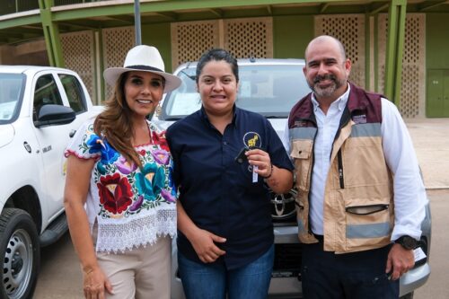 “Estamos entregando 4 camionetas totalmente equipadas para trabajar en beneficio de las y los ganaderos y que van directo a las brigadas que ya recorren rancherías, ejidos y comunidades para proteger al ganado de la rabia y el gusano barrenador”, dijo Mara Lezama.