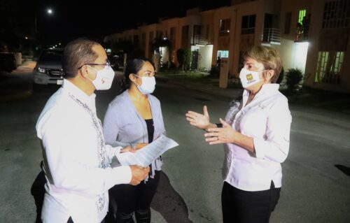 Durante un recorrido en el fraccionamiento Palmas II, la presidenta Laura Beristain, acompañada del titular de Servicios Públicos Municipales, Juan Carlos Segura Espadas, constató los trabajos de mantenimiento y cambio de luminarias en las calles Palma Baru, Palma Gaviota y Chat.