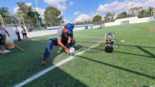 Asimismo, se colabora para que las instalaciones deportivas de la cancha de futbol del fraccionamiento Villas Riviera tengan el mantenimiento necesario para beneficio de la población en general.