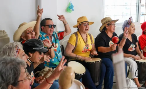 Al llegar al evento, la Primera Autoridad Municipal, junto a la Presidenta Honoraria del DIF estatal, bailó y convivió con los adultos mayores, quienes realizaban una dinámica para aprender a tocar instrumentos musicales; disfrutando de la música de los 70s y samba, así como actividades de integración y respiración.