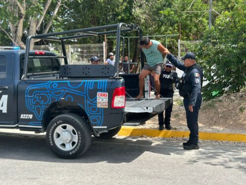 Playa del Carmen, Q. Roo, 8 de julio de 2025.- Un hombre fue detenido por maestros de una secundaria y ciudadanos en el fraccionamiento Villas del Sol, tras ser sorprendido acosando a menores de edad y mujeres que transitaban por la avenida Periférico, en el cruce con avenida CTM y avenida de las Cigüeñas.