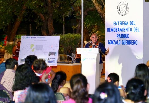 PLAYA DEL CARMEN, Quintana Roo, 30 de agosto.- En beneficio de más de 650 familias, la Presidenta Municipal de Solidaridad, Cristina Torres Gómez, entregó a los vecinos de la colonia Gonzalo Guerrero, el parque con mejoras y develó el nuevo monumento que representa al llamado “Padre del Mestizaje”, su esposa Zazil Ha y sus hijos.
