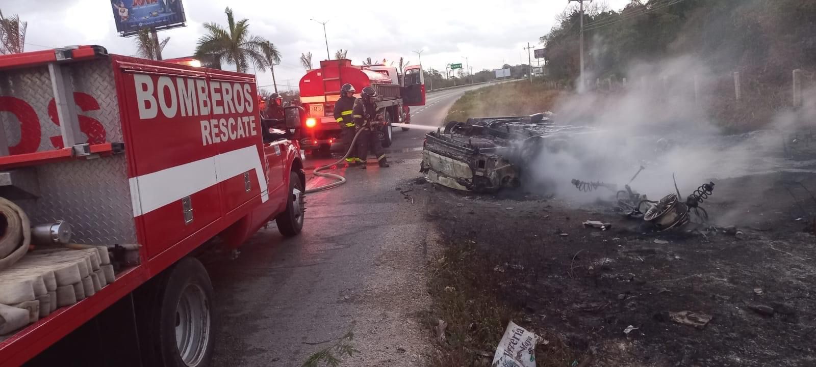 PLAYA DEL CARMEN, Quintana Roo, 29 de Abril del 2024.- Automovilistas reportaron que un vehículo se estaba incendiando luego de que se volcara, esto en la salida norte de la ciudad, por lo que fue necesaria la intervención de los Bomberos, sus ocupantes lograron salir aunque terminaron lesionados.