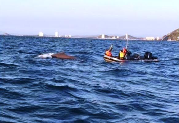 Para ello, se coordinaron acciones con la Secretaría de Marina (Semar), Capitanía de Puerto y el Escuadrón Acuático de Protección Civil, quienes colocaron tres boyas para ubicar al ejemplar, con la intención de agotarlo y poder quitar la cuerda que impedía el movimiento del cetáceo.