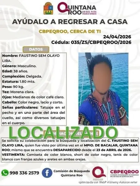 CHETUMAL, Quintana Roo, 27 de abril. – El joven reportado como desaparecido el 13 de abril en Bacalar, Faustino Sem Olayo Lira, fue localizado con vida. La fiscal del distrito sur de Quintana Roo, Estela Noemi Labastida Rodríguez, confirmó que se encontraba privado de su libertad, y que hasta ahora no hay personas detenidas por el secuestro.