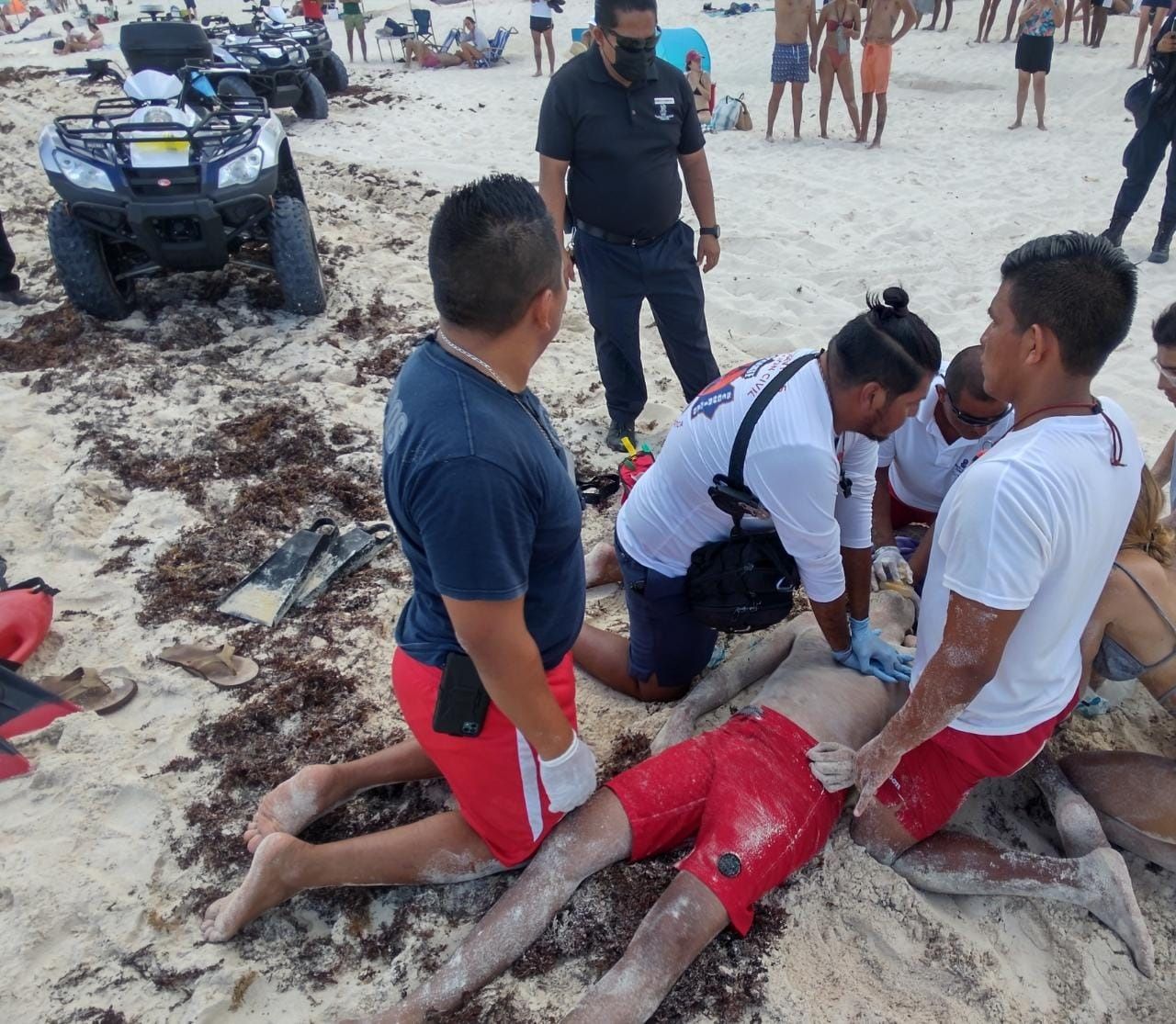 De acuerdo con el reporte, en la playa, ya se encontraban afuera del agua, un adulto, que no proporciona su nombre, una joven, identificada como F.A. R.G., de 19, originaria de Cancún, así como J. I.A.M., de 22, originario también de Cancún y al que le estaban dando resucitación pulmonar.