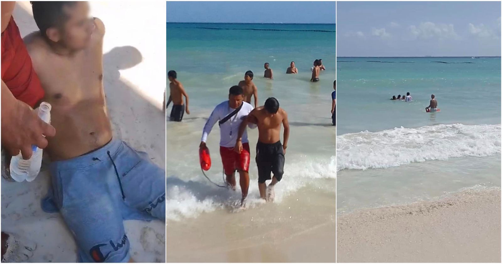 En el primer caso, un joven de aproximadamente 20 años de edad, que se adentró para pasar la barrera antisargazo, donde sintió que ya no podía volver por la corriente en su contra y empieza a hacer señales de auxilio para evitar ahogarse.