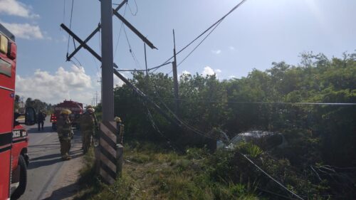 TULUM, Quintana Roo 11 de junio de 2025.- Una mujer de origen argentino salvó la vida de forma milagrosa tras salirse de la vía y chocar contra un poste de alta tensión la mañana de este miércoles, cuando circulaba sobre la carretera federal Tulum–Playa del Carmen, a la altura del cenote Ya’ax Mu’ul.