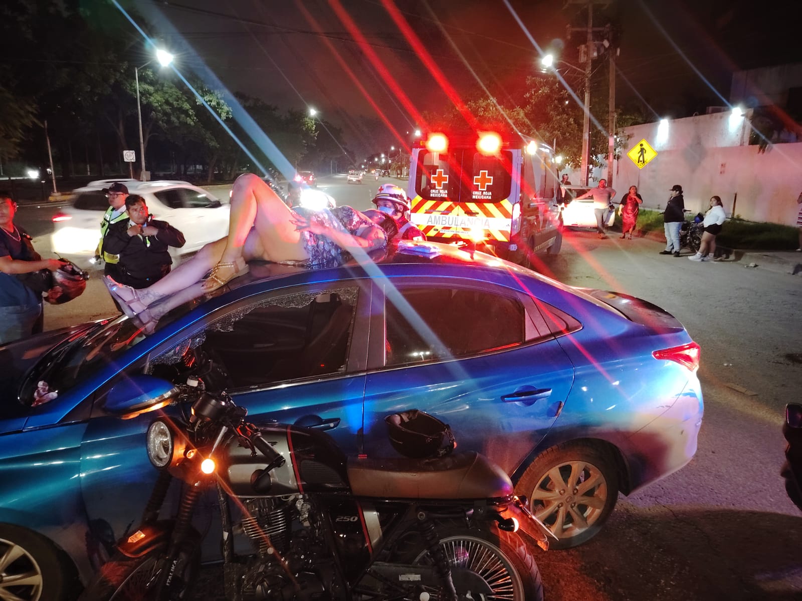 CANCÚN, Quintana Roo, 26 de diciembre de 2025.- Un fuerte accidente de tránsito se registró durante la madrugada de este jueves en la intersección de la avenida 20 de Noviembre con la avenida Chacmol, donde una motocicleta y un vehículo particular colisionaron, dejando como saldo a una mujer lesionada, quien presuntamente se encuentra embarazada.