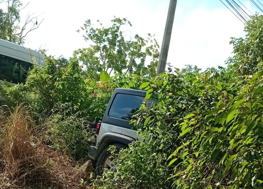 PLAYA DEL CARMEN, Quintana Roo, 10 de enero de 2026.— Un incidente de conducción imprudente y confrontación vial provocó que una camioneta terminara fuera de la cinta asfáltica, al internarse en un área verde en la entrada norte de Playa del Carmen, luego de que su conductor perdiera el control del volante al frenar bruscamente para evitar un choque.