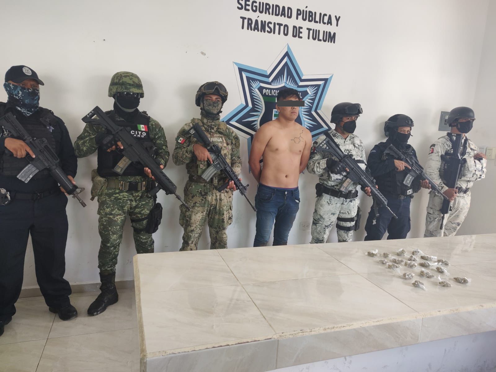 El masculino fue detenido al filo de las 14:00 horas en la zona costera de Tulum, específicamente sobre la calle boca Paila-Punta Allen, como parte del operativo “Fortalecimiento de Acciones y Protección Ciudadana” que encabezó la Policía Municipal en coordinación con la Guardia Nacional, el Ejército Mexicano, la Marina Armada de México y Policía Quintana Roo.