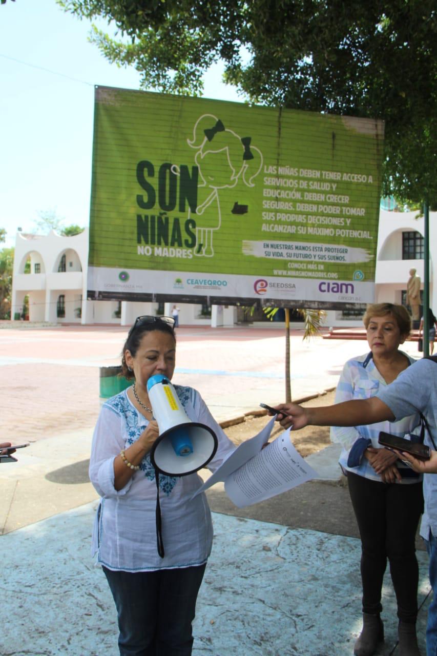 Esta agrupación hoy se manifestó afuera del Palacio Municipal, con una lona con la leyenda “Son Niñas No Madres” y con pupitres escolares vacíos, para representar a estas menores abusadas, que ya no pudieron seguir sus estudios.