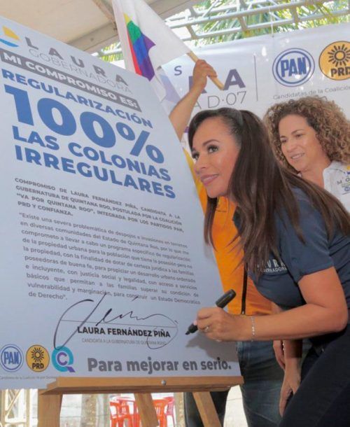 CANCÚN, 15 de mayo.— Laura Fernández firmó un compromiso para legalizar en los primeros 24 meses de su gobierno las colonias irregulares del Estado, para que todas las familias mejoren en serio.