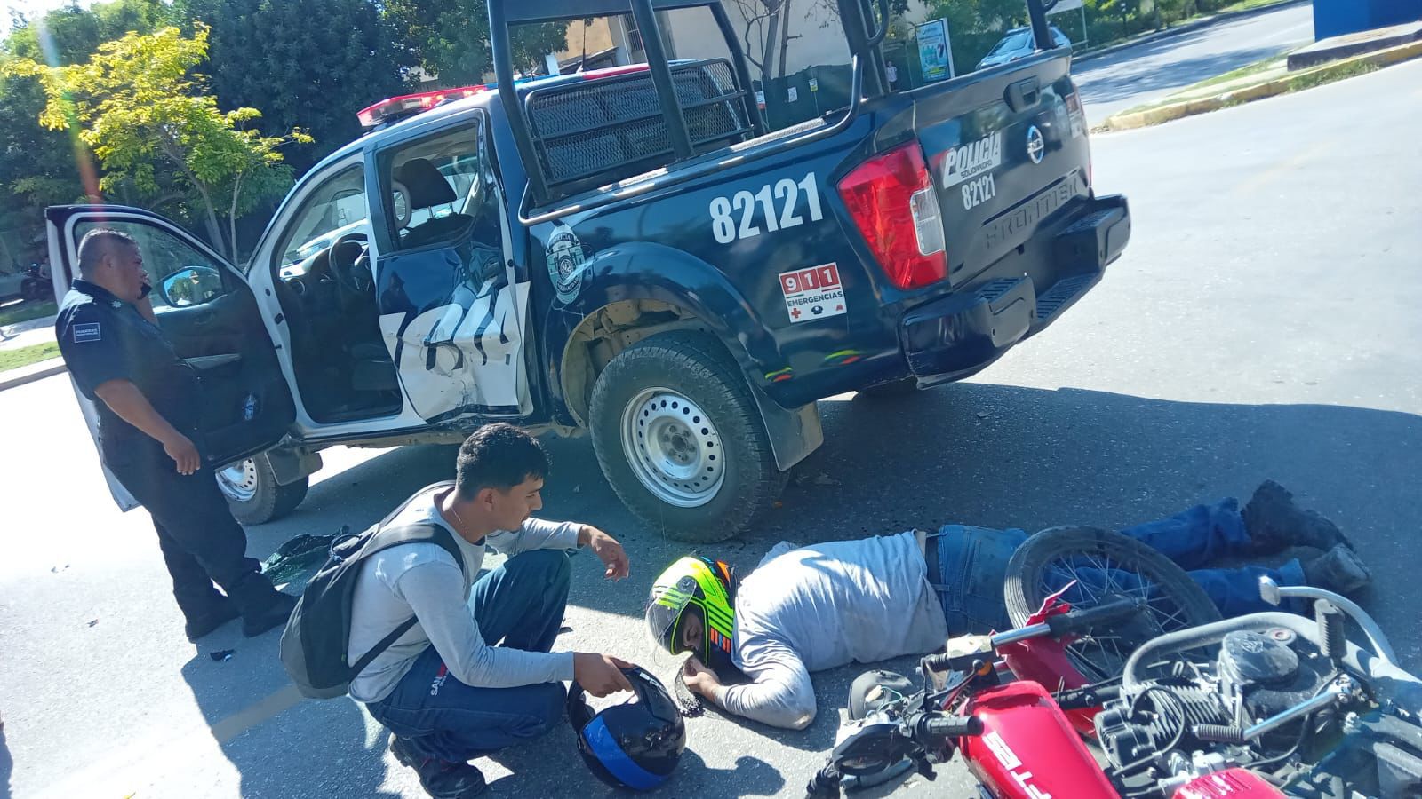 PLAYA DEL CARMEN, Quintana Roo, 08 noviembre. – Al salir sin precaución de la entrada del fraccionamiento la Toscana un elemento de la Policía Municipal provocó que un motociclista se impactara en un costado de su patrulla, por lo que el joven fue trasladado al hospital por paramédicos.