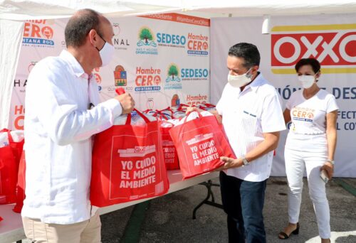 CANCÚN, Quintana Roo, 10 de diciembre. –  El gobernador Carlos Joaquín recibió la donación de 907 despensas de la cadena comercial OXXO, que se suman al programa “Hambre Cero” para reducir la carencia alimentaria de las familias afectadas por la pandemia de la covid-19.