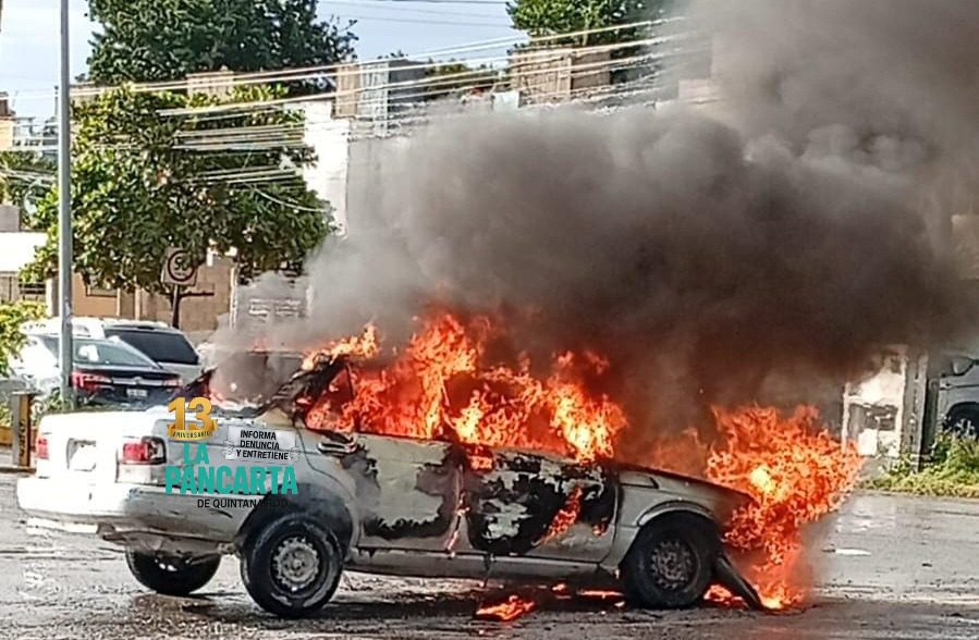 CANCÚN, Quintana Roo, 12 de enero de 2026.– Un automóvil particular fue consumido por el fuego la mañana de este lunes en el cruce de las avenidas Chacmol y Jacinto Pat, luego de que presuntamente presentara una falla mecánica mientras se encontraba en circulación. El incidente provocó la movilización de cuerpos de emergencia y afectaciones temporales al tránsito, sin que se reportaran personas lesionadas.