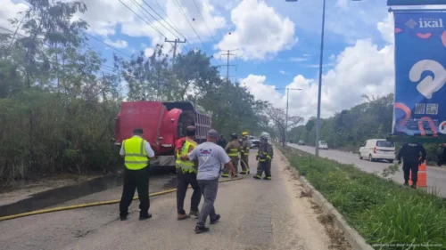 CANCÚN, Quintana Roo, 02 de abril de 2026.- Un aparatoso incendio de un camión tipo volteo se registró sobre el Arco Norte, a escasos metros de la avenida Niños Héroes, presuntamente a causa de una falla mecánica, dejando como saldo al operador de la unidad con diversas quemaduras.