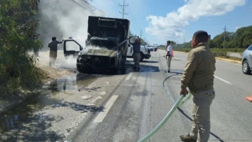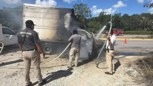 Playa del Carmen, 29 de enero de 2026.- La mañana de este jueves 29 de enero de 2026, una camioneta de carga tipo caja seca se incendió mientras circulaba sobre la carretera federal Playa del Carmen–Tulum, a la altura del hotel Bahía Príncipe.