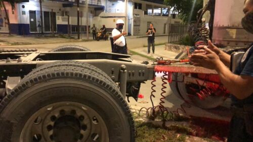 De acuerdo con los “traileros” al “dolly” se le rompieron las mangueras de aire por lo que las ocho ruedas quedaron “amarradas”.