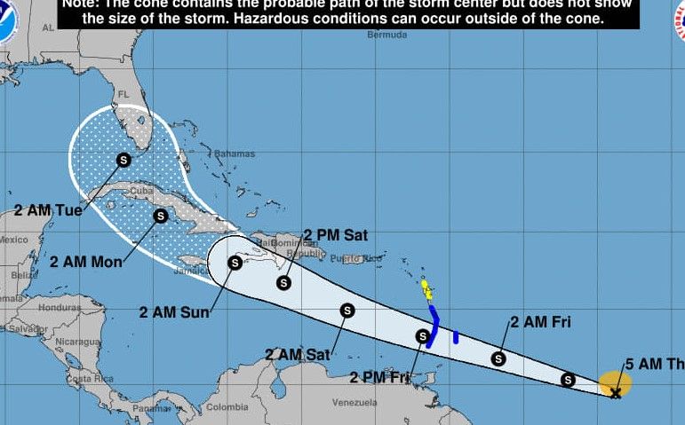 Explicó a través de un comunicado que a las 4:00 horas de este jueves su centro se localizaba a 4,270 kilómetros de las costas de Quintana Roo, presenta vientos máximos sostenidos de 65 km/h, rachas de 85 km/h y desplazamiento hacia el Oeste a 41 km/h.