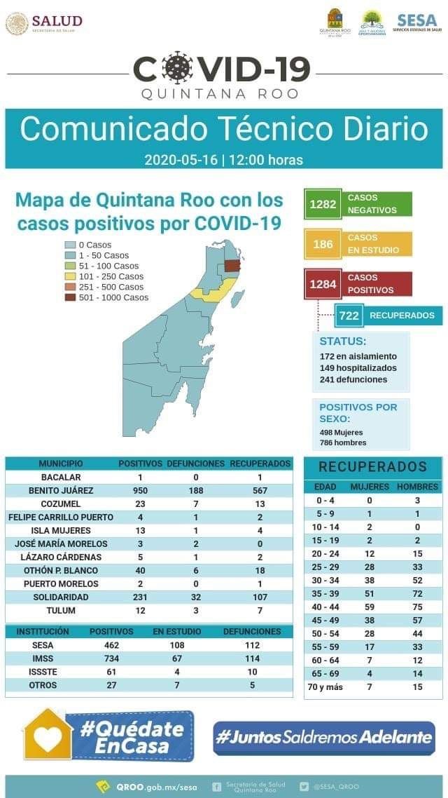 CHETUMAL, Quintana Roo, 16 de mayo.- Hasta este sábado en Quintana Roo se registraron 241 defunciones y mil 284 casos positivos de Covid-19 en Quintana Roo, de acuerdo a las estadísticas de la Secretaría Estatal de Salud (Sesa). Todos los decesos se dieron en la ciudad de Cancún.