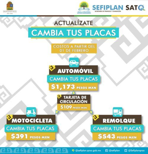 QUINTANA ROO, 29 de enero.- Por el aumento de la Unidad de Medida y Actualización (UMA), se modifican los costos para el canje de placas, las cuales tendrán un valor de 1,173 pesos para automóviles, para motocicletas tendrán un costo de 391 pesos; para remolque 543 pesos más la tarjeta de circulación de 109 pesos.