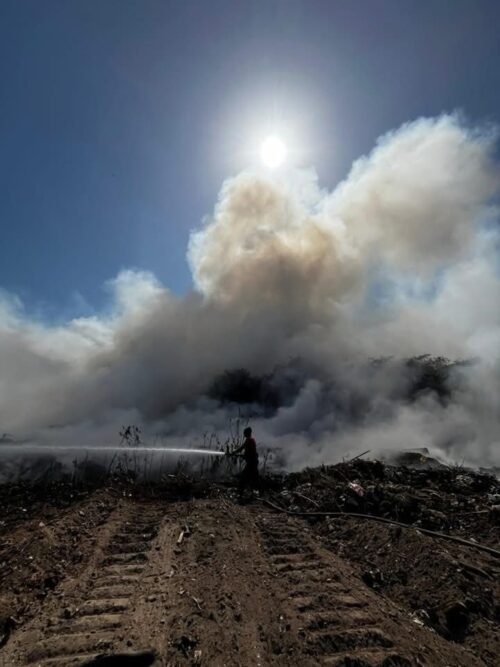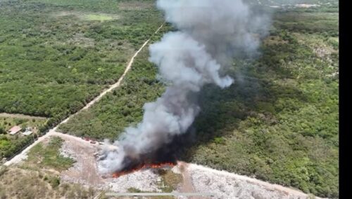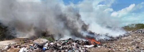 Chetumal, Q. Roo, 31 de mayo.— Un incendio de gran magnitud se registra esta tarde en el tiradero a cielo abierto de Calderitas, provocando una intensa movilización del cuerpo de Bomberos de Chetumal para controlar las llamas que amenazan con extenderse.