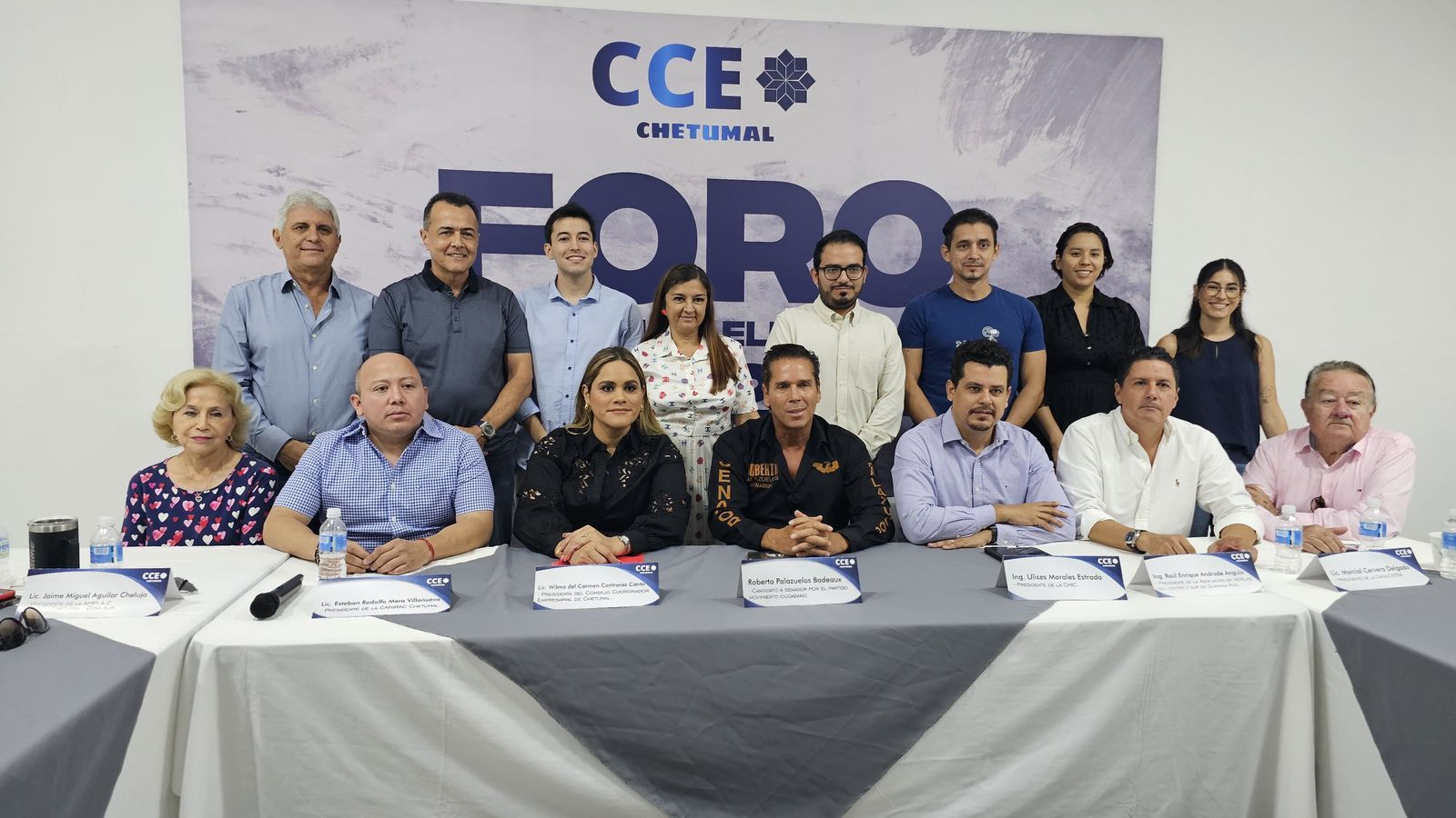 La segunda mesa la presidio la Lic. Wilma del Carmen Contreras Canto, Presidenta del Consejo Coordinador Empresarial de Chetumal y la acompañaron: el Lic. Marcial Cervera Delgado, Presidente de la CANACINTRA; el ingeniero Raúl Enrique Andrade Angulo, Presidente de la Asociación de Hoteles del Centro y Sur de Quintana Roo; el Lic. Esteban Rodolfo Mera Villanueva, Presidente de la CANIRAC de Chetumal; el Lic. Jaime Miguel Aguilar Cheluja, Presidente de la AMPI A.C Sección Chetumal-Zona Sur; la Lic. Adriana Gaytán Terrazas, Presidenta del Comité Promotor de Responsabilidad Social Empresarial en la Zona Sur, Aliarse; Emir Padilla Espadas, Presidente de la Canaco Servytur Chetumal-Tulum; Marcial Cervera Delgado, Presidente de la Cámara Nacional de la Industria de la Transformación (CANACINTRA) en el sur de Quintana Roo y Raúl Villanueva Arguelles, Presidente de la Confederación Patronal de la República Mexicana (COPARMEX) en Chetumal; quienes agradecieron la presencia y participación del abanderado naranja.