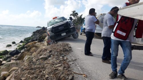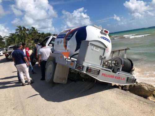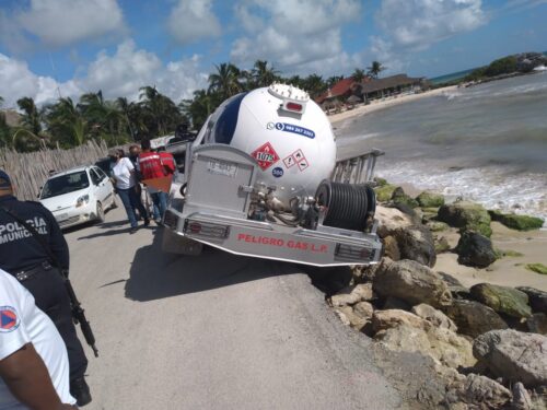 Alrededor de las 10:40 horas de este lunes, a través del número de emergencias 911, ciudadanos alertaron a los cuerpos de emergencias, debido a que minutos antes una pipa de gas, estaba a punto de precipitarse al mar.