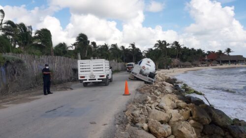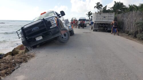TULUM, Quintana Roo, 16 de noviembre. – Una pipa de gas que circulaba por el tramo costero Tulum-Boca Paila se salió de la cinta asfáltica al intentar evadir un bache y colisionar contra otro automóvil.