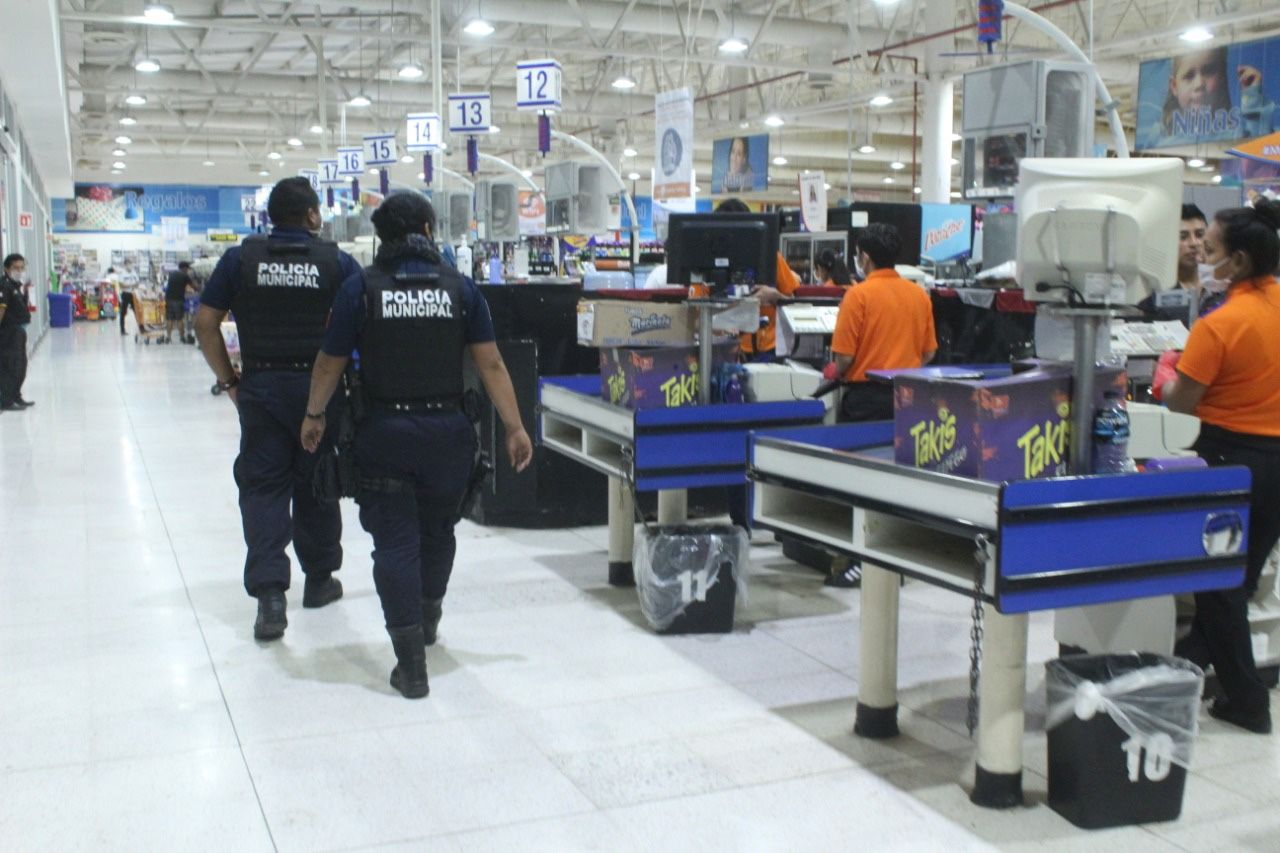 Los policías municipales realizan recorridos en los centros comerciales y fortalecen la vigilancia con presencia a pie dentro de las instalaciones y alrededor de los supermercados con vigilancia a bordo de las patrullas, principalmente en horarios nocturnos para garantizar que no se altere el orden y evitar saqueos.