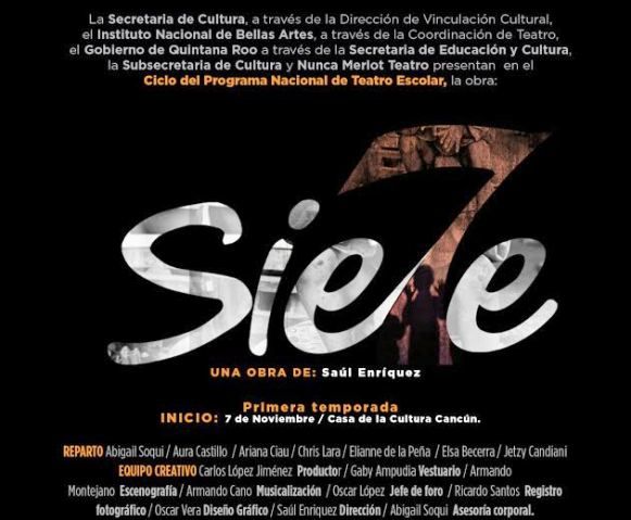 CHETUMAL, Quintana Roo, 11 de noviembre.- Casi 12 mil espectadores, entre estudiantes de secundaria y preparatoria, así como público mayor de 12 años, tendrán la oportunidad de disfrutar de la pieza teatral titulada “Siete”, obra de Saúl Enríquez, la cual resultó ganadora en la convocatoria emitida por la Secretaría de Cultura (SC), para encauzar el talento de los creadores con gran calidad artística y cultural.