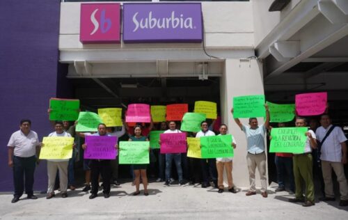 CANCÚN, Quintana Roo, 12 de junio. – En reclamo al reparto de utilidades, pago de bono anual e incremento salarial, de forma simultánea trabajadores de la tienda departamental Suburbia se manifestaron Cancún y Playa del Carmen, por más de 2 horas y media esta tarde en las entradas principales de las tiendas.