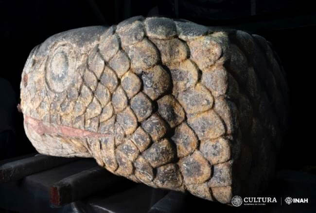 El sismo de 2017 dejó al descubierto una cabeza de serpiente mexica./Imagen Centro INAH Hidalgo FacebookEsta pieza de 1.80 metros de largo, conserva un 80% de sus colores y los especialistas la mantienen en una cámara sellada para que poco a poco pierda la humedad acumulada y se puedan descifrar sus colores originales.