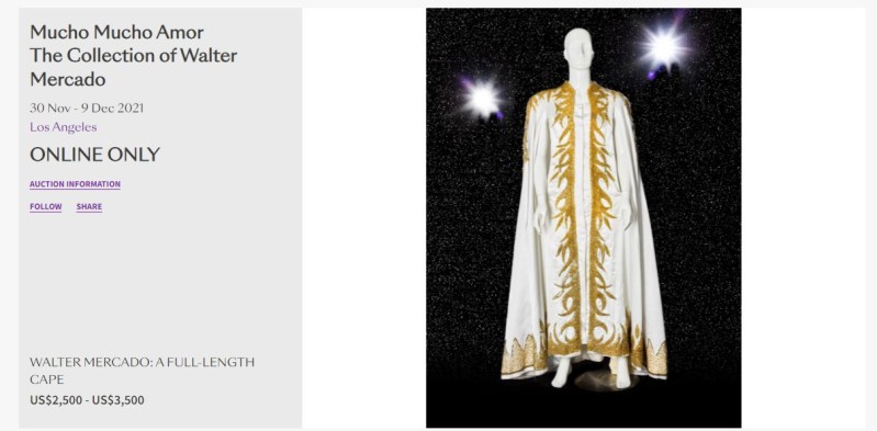 La subasta incluye una capa, hecha de seda blanca adornada con cuentas de oro, lentejuelas y detalles de encaje, con un valor estimado entre 2 mil 500 a 3 mil 500 dólares.