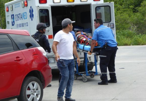 PLAYA DEL CARMEN, Quintana Roo, 14 de julio.- Una vez más la falta de precaución al conducir provocó un trágico accidente en la Avenida 110 y la Calle 38 cerca de la centro comercial Plaza las Américas, en el que lamentablemente un joven resultó severamente lesionado, con amputación osea no dirigida en su pierna derecha por lo que fue trasladado al hospital con pronóstico reservado por la gravedad de sus lesiones.