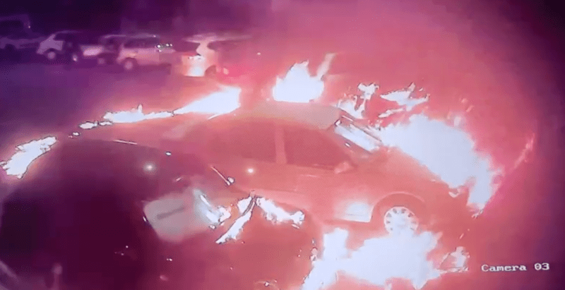 En las imágenes de las cámaras de seguridad se observa el momento en que los dos sujetos encapuchados llegan al lugar con un garrafón lleno de gasolina y lo rocían sobre los vehículos estacionados.