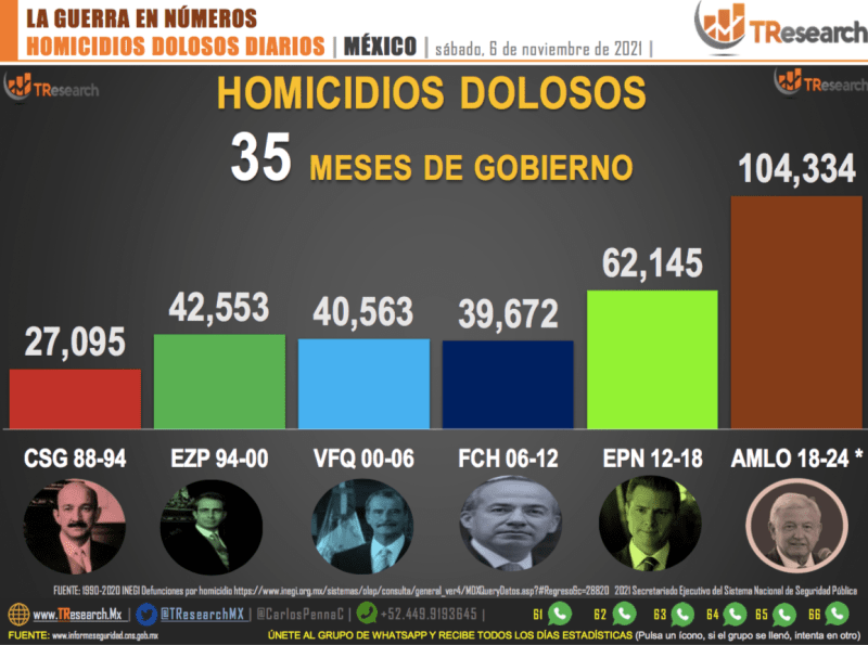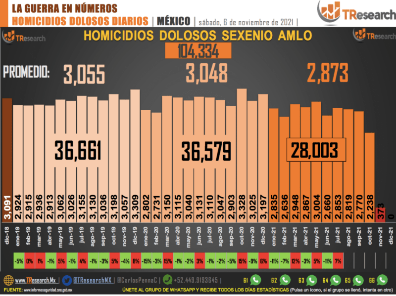 El reporte ‘MX: La Guerra en Números’, de T-ResearchMX, detalla que, de acuerdo con el registro de homicidios dolosos de la Secretaría de Seguridad y Protección Ciudadana, del 1 de diciembre de 2018 al 6 de noviembre de 2021, tiempo que lleva la actual Administración del presidente Andrés Manuel López Obrador, las fiscalías estatales y federales han registrado 104 mil 334 homicidios dolosos en México.
