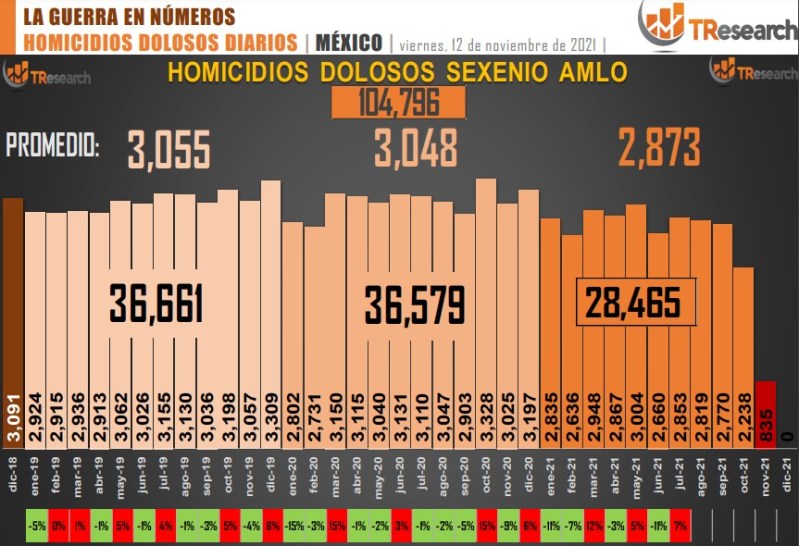 El reporte ‘MX: La Guerra en Números’, de T-ResearchMX, detalla que, de acuerdo con el registro de homicidios dolosos de la Secretaría de Seguridad y Protección Ciudadana, del 1 de diciembre de 2018 al 11 de noviembre de 2021, tiempo que lleva la actual Administración del presidente Andrés Manuel López Obrador, las fiscalías estatales y federales han registrado 104 mil 796 homicidios dolosos en México.